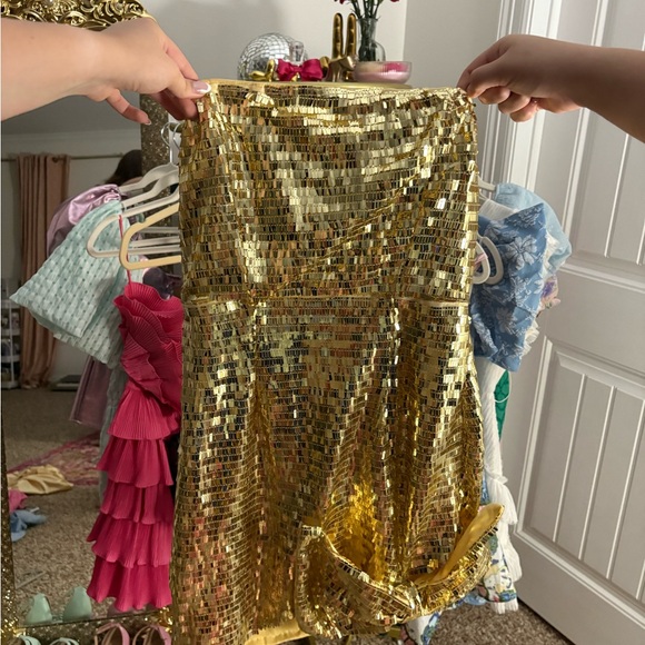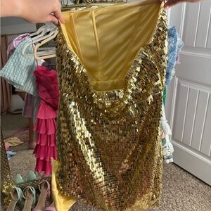Shimmering gold mini dress. Perfect for parties. Eye-catching sequin design. Cute bow detail. Never worn!