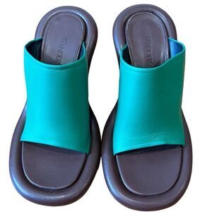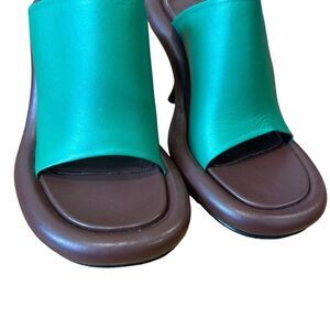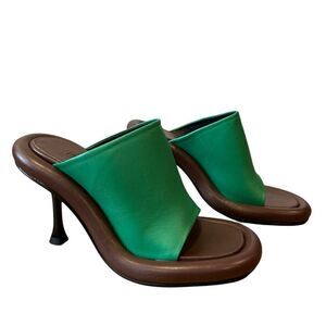 Mocha/green calf leather Bumper-Tube leather mules from JW Anderson featuring open toe, slip-on style, single toe strap, branded insole, high heel and leather lining .