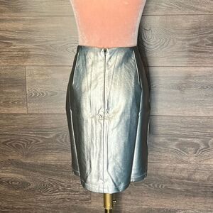 Give a classic skirt a pop with a metallic leather finish. Pair it back with a casual top for a day to day look or a blouse for a chic night out. Fully lined. Metallic faux leather fabric. Side slits. Hidden back zipper closure.