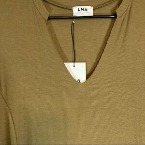 Brand new has never been worn tag is still attached no rips, tears or stains. Fresh from one of our favorite labels for creative knitwear basics, this sleek LNA dress is a sophisticated weekend alternative to your usual tee and jeans. Cut-and-sew construction and a split neckline add a touch of deconstructed edge to this silhouette. Light weight slinky ribbed jersey, unfinished edges, split hem and v-neckline.