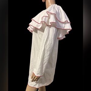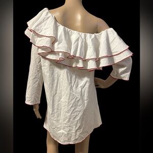 READ ALL: There is a slight discoration in left armpit.This is the only flaw on this dress.Chic one shoulder dress with bold ruffle trim by Lovers+Friends sold at Revolve.Features white cotton fabric with red accents and a full cotton lining. One sleeve full length and one 3/4 length. Excellent condition in a size M. See flat lay measurements and extra details below before purchase Size:M Pit to pit:19” Length:26” White with red trim, ruffles, off the shoulder collar, fully lined