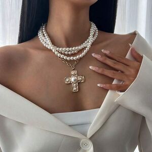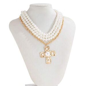 Elegant pearl necklace with a gold cross pendant. Perfect for any occasion.