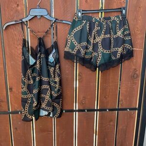 REVOLVE Plush SILKY PAJAMA Chain Link Pajama Set Black & Green small NWT