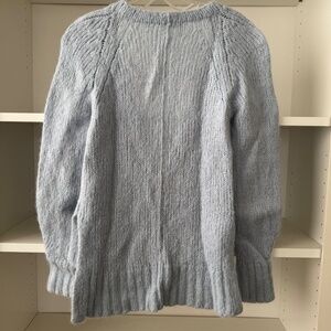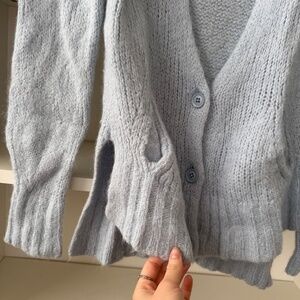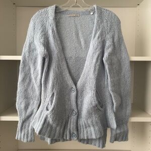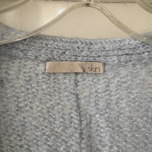 REVOLVE Skin soft blue cardigan. Balloon sleeve. Button up front. Front pockets. High low hem. 47% suri alpca 53% silk. Size xs. Great preloved condition, tiniest hole in the back. Buttons are loose on purpose, this is the style from the manufacturer. 15" pit to pit laying flat. 23" length in front 25" long in back