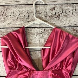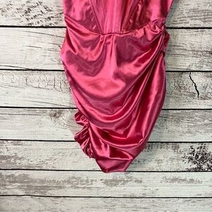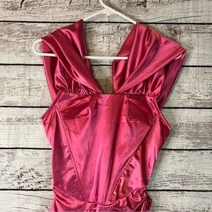 In excellent used condition no rips, tears or stains. Currently still on Revolve's site. Superdown Aurora Corset mini dress in Magenta. Fully lined. Hidden zipper in back. Boned bodice with off shoulders draped sleeves. Surplice skirt with ruched sides. Satin Fabric.