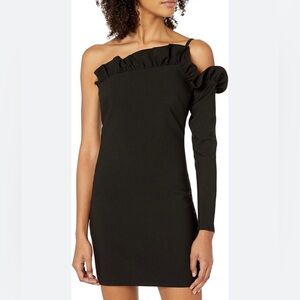 The perfect addition to your wardrobe collection! • THE dress for all occasions! Mini dress is designed with a dynamic one shoulder neckline and subtle feminine ruffles. • Gently used once. Dry cleaned. Ready to be worn. In good condition. Flared sleeve. Side seam zipper with hook-and-eye closure. Black. Size 12. • Measurements: Chest = 17.5 inches across. Length = 32 inches long. Rayon/polyester/spandex. • Listed across numerous platforms so once it’s gone, it’s gone!