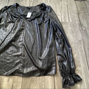 Featuring puffed sleeves and a shimmery finish, this blouse pairs perfectly with your favorite fitted denim. Polyester, spandex Puffed sleeves Spliced neck with tie Pullover styling