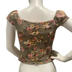 This cute floral top features a square neck, tortoiseshell buttons and off-the-shoulder cap sleeves.