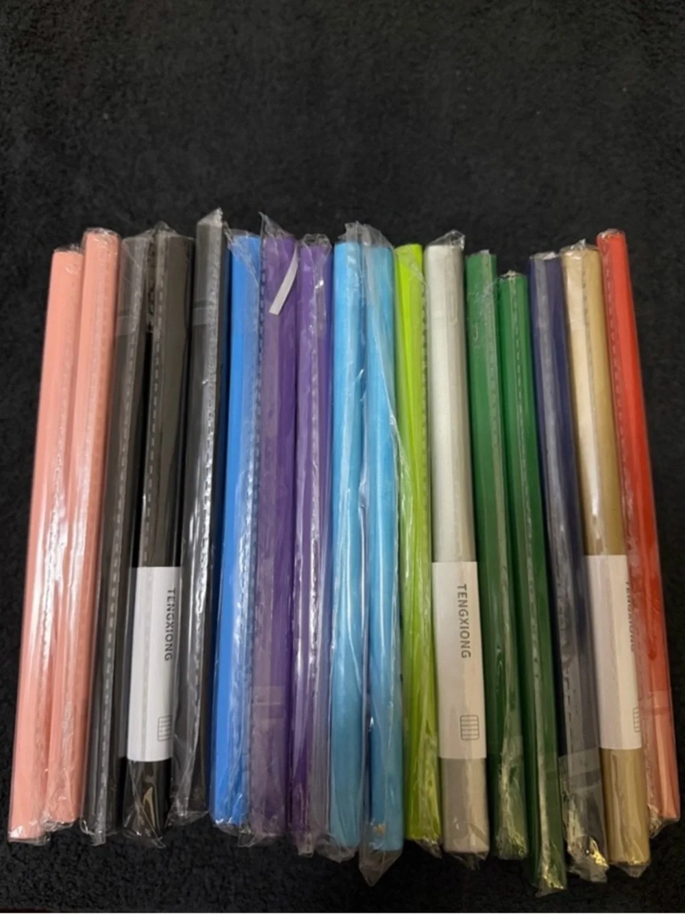 Bundle of slim notebooks in assorted colors. Each has a smooth cover and elastic band. Great for notes, lists, and journaling. Sold as a set.