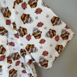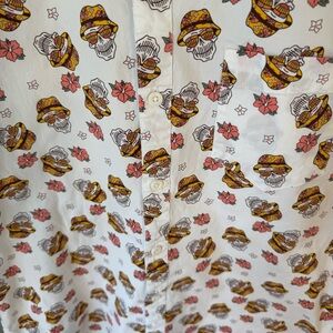 Features: tropical skull pattern, lightweight, button up, short sleeves
