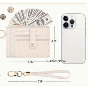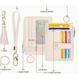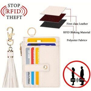 This RFID blocking leather card holder wallet offers secure storage for credit cards and IDs. Equipped with a keychain wristlet and tassel for added convenience.