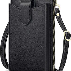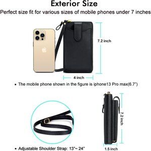 Features: This chic mini crossbody wallet is crafted from premium faux leather, with a sleek black finish. It features a secure zipper closure, six RFID-blocking card slots with a flap, and a front elastic phone pouch for quick access. The soft lining and stylish tassel pendant add a touch of elegance. The structured yet lightweight design makes it easy to carry your essentials without bulk.