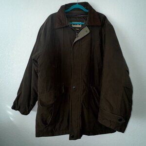 Army Brown color. Outside shell is nylon while the inside detachable liner is polyester (waterproof). Regular fit. Collared neck.