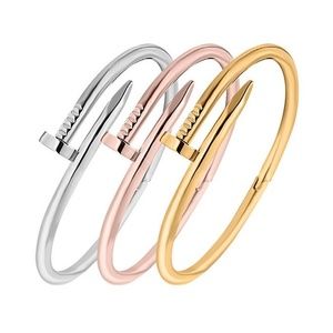 The bracelet opens with a hinge at the bottom and closes/ locks where the head of the nail meets the last 1/2 inch of the nail.
