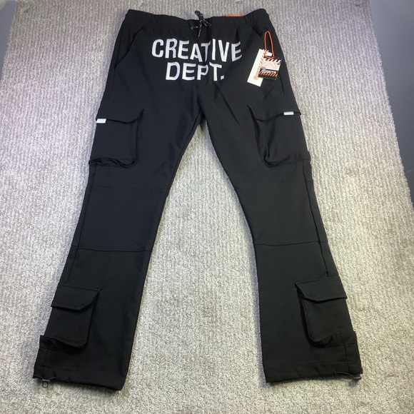 Stylish and functional cargo pants by RGSTR's Creative Dept. offer a modern take on a classic silhouette. These black pants feature a bold "CREATIVE DEPT." graphic on the front, multiple cargo pockets for ample storage, and a comfortable drawstring waistband for an adjustable fit. Made with a premium tech stretch fabric, they offer both flexibility and durability. These pants are suitable for casual outings, streetwear fashion, or relaxed weekend wear.
