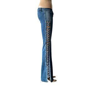 -Cotton with elastane stretch, low-rise flair, long and lean with awesome side cut-outs down both sides of legs