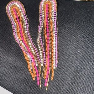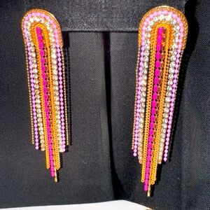 These striking, limited-edition earrings are sure to turn heads! Each earring boasts a glamorous, cascading design featuring shimmering strands of delicate beads, and pave set rhinestones in a beautiful palette of soft lilac, vibrant fuchsia, and warm peach. The beads are meticulously arranged, creating a dazzling fringe that catches the light with every movement.