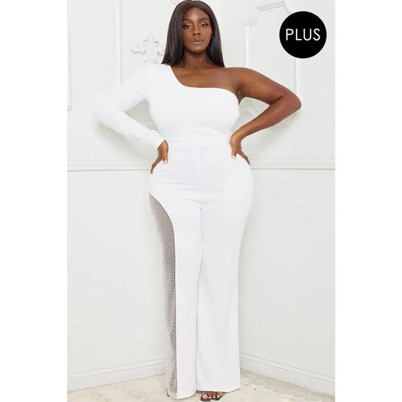 RHINESTONE ON MESH ONE SHOULDER PLUS SIZE JUMPSUIT 3XL WHITE