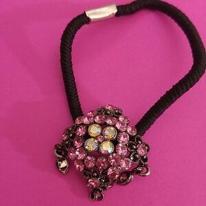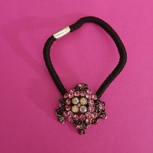 Fancy pink, gold multi color rhinestones with black elastic band to secure pony tail to stay into place.