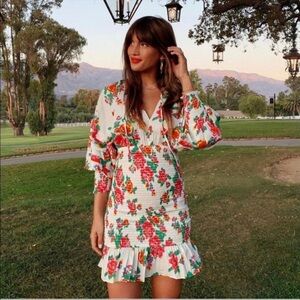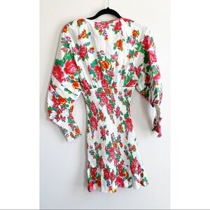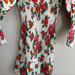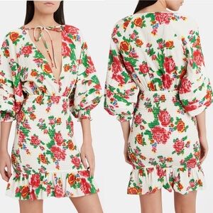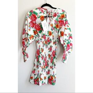 RHODE Anya Smocked Floral Dress; The label's resort-ready cotton poplin dress features figure-flattering smocking and vibrant tropical floral print. V-neck with tie closure. Three-quarter tiered puff sleeves. Flounce hem. In white/floral.