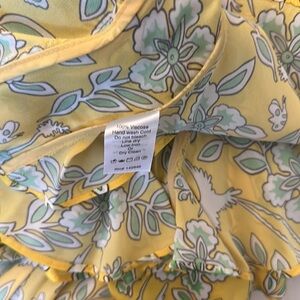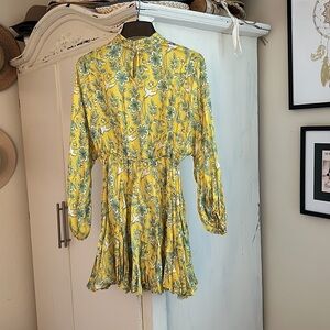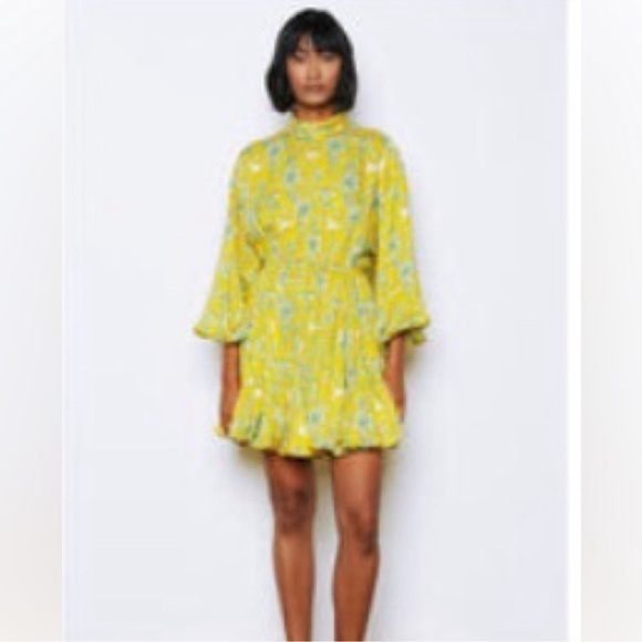 NWOT RHODE| Caroline beautiful yellow and green with hummingbird printed details gathered elastic waist long sleeve mini dress size S