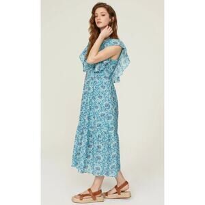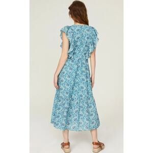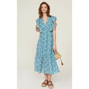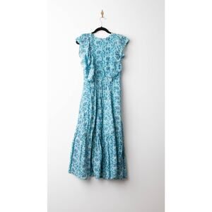 Blue floral cotton blend (52% Cotton, 48% Viscose). Shift. Cap sleeves. V-neck. Back zipper closure