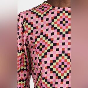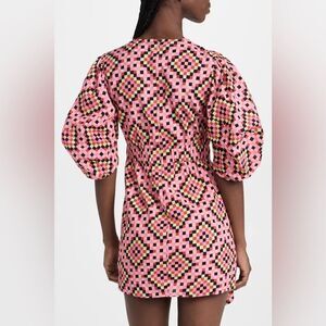 Gorgeous Rhode diamond sunset pia dress. Never been worn, with tags attached. The Pia mini dress is a showstopper. Featuring billowy short sleeves, a flattering waistband and elegant ruched asymmetric skirt which drapes into a waterfall ruffle.
