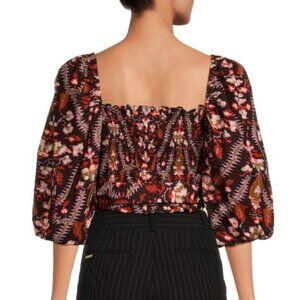 RHODE 'Iris' top featuring puffed sleeves, wrap-front styling and a bold print on a soft, textured-cotton fabrication.