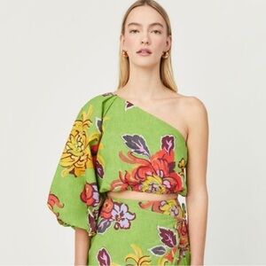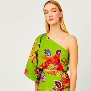 RHODE Kristie One Shoulder Puff Sleeve Top in Green Lanai Print. Size 0 NWT