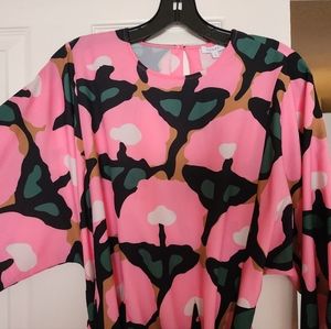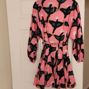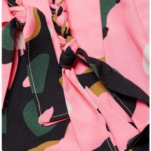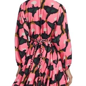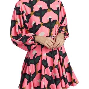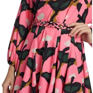 Graphic print ruffle minidress styled with voluminous balloon sleeves and a braided belt.