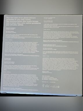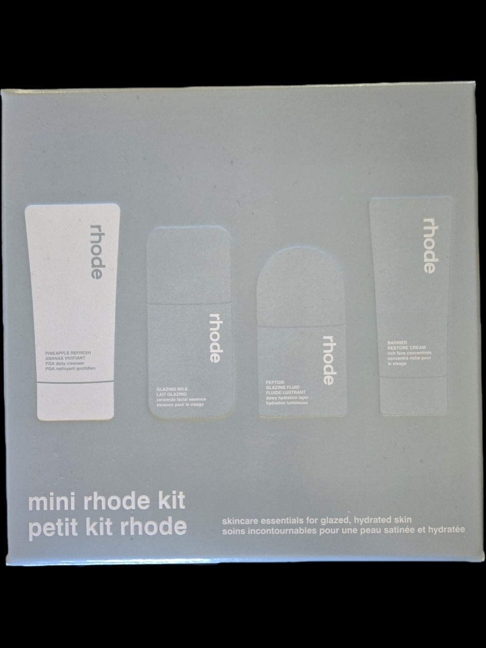 Mini skincare collection by RHODE. Includes : Little Pineapple Refresh (40mL / 1.35 fl oz), Little Glazing Milk (50mL / 1.7 fl oz), Little Peptide Glazing Fluid (15mL/ 0.5 fl oz), Little Barrier Restore Cream (30mL/ 1.0 fl oz).