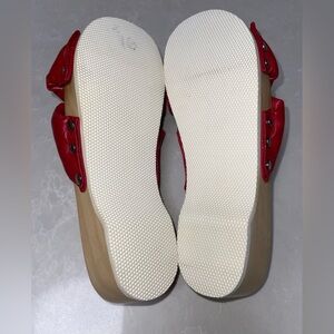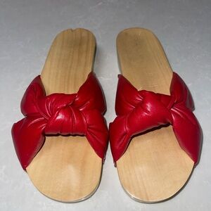 These striking red mules feature twisted straps that create a bold, eye-catching design. The light wooden soles add a touch of natural elegance, while the studs along the edges provide a hint of modern flair. Perfect for casual summer outings, these mules combine comfort with a stylish twist.