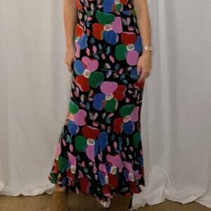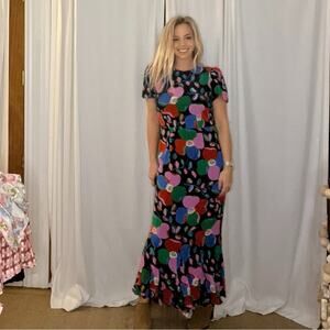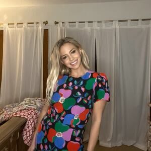 Vibrant floral print. Short sleeves. Flared hem. Perfect for any occasion.