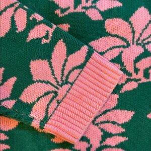Stylish crew neck sweater with floral pattern. Features pink and green colors. Perfect for casual wear.