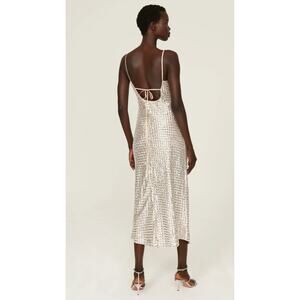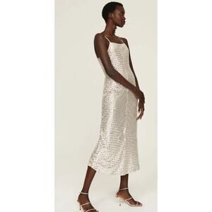 Silver sequins (100% Silk). Slip. Sleeveless. Square neck. Tie closure. 46.5" from shoulder to hemline. Imported.