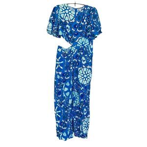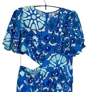 Target. Adorned with allover large zinnia print in blue and light blue shades, this jumpsuit is designed with a high neckline, short bell sleeves, a statement cutout on the right side, side pockets, and a zipper fastening on the side. It has a flowy drape and is made of lightweight, breathable linen-blend fabric for comfortable wear.