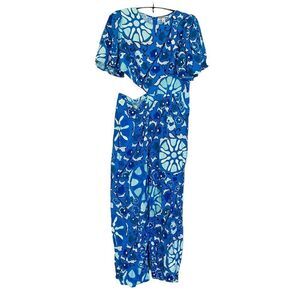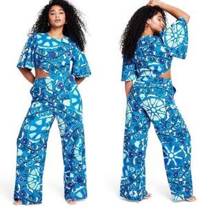 Target. Adorned with allover large zinnia print in blue and light blue shades, this jumpsuit is designed with a high neckline, short bell sleeves, a statement cutout on the right side, side pockets, and a zipper fastening on the side. It has a flowy drape and is made of lightweight, breathable linen-blend fabric for comfortable wear.