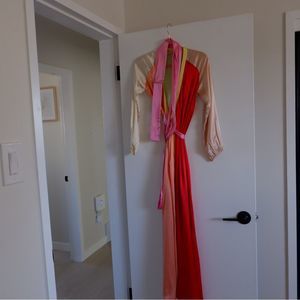 A flowing Rhode Resort maxi dress composed of luxe silk charmeuse. An attached self-belt secures the crossover placket. On-seam pockets. Long sleeves with elastic cuffs. Unlined.