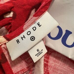 Vibrant floral dress by RHODE. Features a bold red and pink pattern. Flowy silhouette with ruffle hem.
