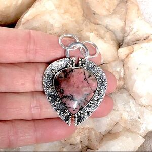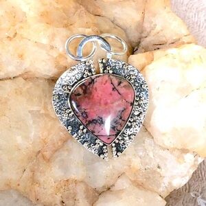 Rhodonite inverted teardrop cabochon set in a stunning, artisan made, textured, antiqued and filigreed modernist solid 925 silver plated pendant with double jump rings. Variations in natural stones and artisan's work make this pendant one of a kind! Rhodonite is said to be a healing stone aiding compassion, an emotional balancer said to clear away emotional wounds and scars from the past.
