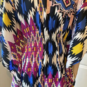 Introducing a beautiful kimono by Rhona Sutton, perfect for your next beach or resort visit. The multicolored paisley pattern is adorned with sequins and a tie accent, giving it a boho, hippie, and summery vibe. The short sleeves and V-neckline make it a great choice for casual occasions as well.