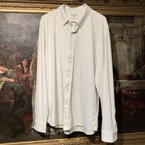 Stylish RHONE button down shirt in white with a faint geometric pattern running through the garment . Perfect for casual wear. Comfortable and sleek design. Men’s size Large and in excellent condition.