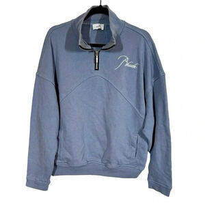 Long sleeve cotton French terry sweater in blue. Rib knit stand collar, cuffs, and hem. Half-zip closure at front. Logo embroidered in white at chest. Dropped shoulders. Welt pockets at waist. Logo embroidered in white at back hem. Logo-engraved silver-tone hardware. Supplier color: Blue