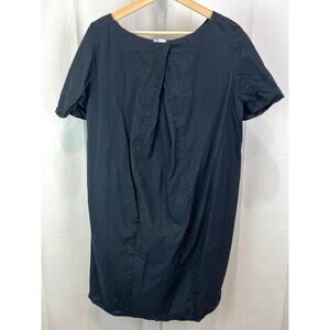 Scoop neck, short sleeves, pullover style, hi-low hem, back crossover pleat, tunic length, relaxed fit. Woven fabric (I believe it's cotton, but the fabric tag was removed) in black with a beaded floral appliqué. Made in India.