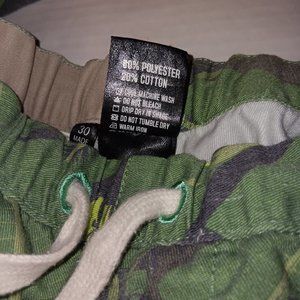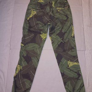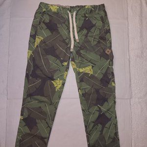 Size 30 Men's Rhythm floral print khaki style jogger pants in a green and brown colorway with functional waistline drawstring and functional pockets in good pre-owned condition