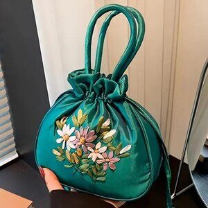 RIBBON EMBROIDERED SATIN DRAWSTRING BAG in Teal
