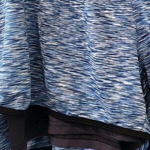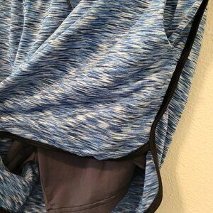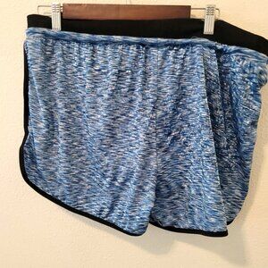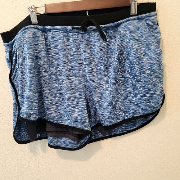 Large 2 in 1 athletic shorts. charcoal gray spandex underneath multi blue shorts. 100% polyester. Has drawstring, some stretching. front pockets. Little fuzz on inside of waistband, otherwise great.