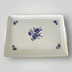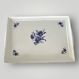 Gorgeous Rectangular serving tray by Richard Ginori, Italy in the Lumeggiato Oro pattern. Pattern has a large blue floral spray in the center with smaller sprays in each corner finished with gold trim and rolled handles. Back is stamped Richard Ginori ITALY