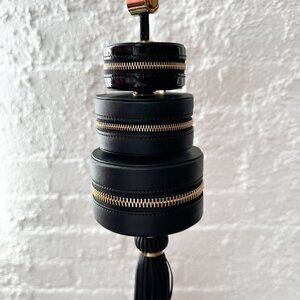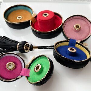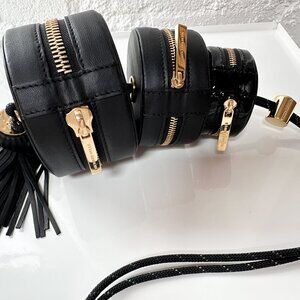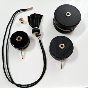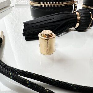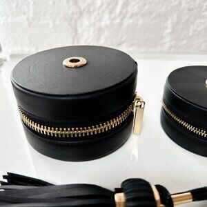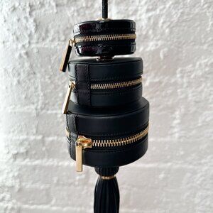 Available here is an ultra ultra rare black leather and gold tone hardware Richard Mille jewelry and watch case. Designed for travel, you could as easily wear it as a standalone accessory. The round zip up storage cases slot through a long braided strap and are held in place with a push button metal cord lock. Lots of ways to combine these modular pieces to change up the look.
