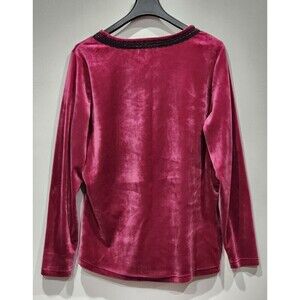 Soft and cozy velour lounge set by Richie House. Bright berry velour faux wrap top and straight leg elastic waist pull-on pants trimmed in black lace with satin bow accent. Size Medium